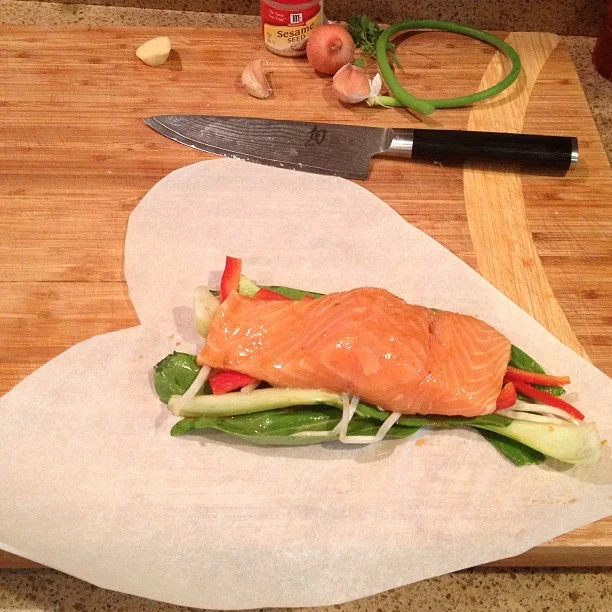 Cooking En Papillote literally means “cooking in a bag”. The most common “bag” is parchment paper, but you can use aluminum foil as well. You end up steaming fun and dramatic presentation when you cut open the bags table side and everyone is hit with the wonderful aroma. Note: I got most of this recipe from Andrew DelVecchio, Chef de Cuisine at Top Chef alum Dale Talde's restaurant.